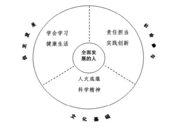 2014年教育部研制印发《关于全面深化课程改革落实立德树人根本任务的意见》,提出“教育部将组织研究提出各学段学生发展核心素养体系,明确学生应具备的适应终身发展和社会发展需要的必备品格和关键能力”,这主要体现在文化基础、自主发展和社会参与三大方面,其中三大方面又可细分为学会学习、健康生活等六个方面,具体如下图: