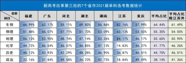以下为新高考改革第三批实行3+1+2方案的省市2021届学生(高二)的各科选考数据,从整体来看各省选科占比相对比较均衡,最受欢迎的科目是生物。