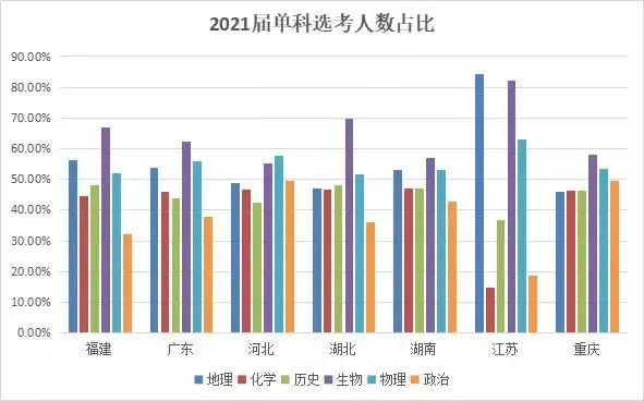 从上述图表中可以看出,生物的选考比例高居首位,紧接着就是物理和地理两门科目选考人数最多,其次就是历史、化学。而政治科目选考人数最少,小编认为这可能与政治这门学科背诵内容多、不容易拿高分的特性有关。