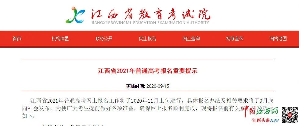 据江西省教育考试院官网消息,江西省2021年普通高考网上报名工作将于2020年11月上旬进行,具体报名办法及相关要求将于9月底向社会发布。