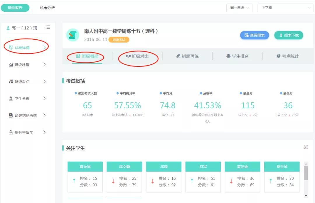 试卷详情将每次考试的数据进行统计与归类。老师可以直观地了解本次考试班级的具体情况如:平均分、及格率、分档统计、大幅进步学生与大幅退步学生等;班级对比让老师明确自身班级与其他班级的差距,为老师的教学方向提供指引。