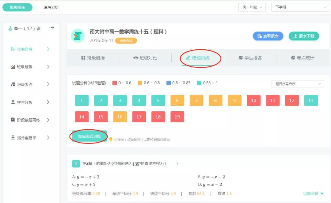 将所有题型进行难度归类与分析,自动统计每道题的难度系数、班级得分率、年级平均分、班级平均分与答对答错人数,以便教师在备试卷讲评课过程中把握对单个知识点的考量;配备变式训练与阶段错题再练,帮助学生管理整个学习过程,拓展思维,并且大量节省教师备课时间,使训练更加精准。