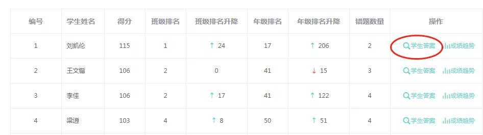 过去,学校通过表格统计出来的排名表只有学科成绩和班级年级排名,而知心慧学基于强大的数据分析能力,将学生的班级排名升降、年级排名升降和错题数量统计在一起,有利于教师充分把握学生在两次考试中的成绩变化趋势。