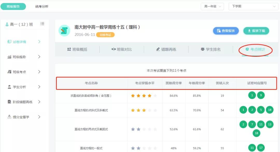 在每次测验结束后,教师可以通过学业报告中的考点统计了解整个年级对各个知识点的掌握情况,系统将考点名称、考生掌握水平、班级得分率、年级得分率和答错人次以表格形式排开,一目了然,教师根据整体学情“抓全面”,明晰学生考考点掌握情况与备课方向。