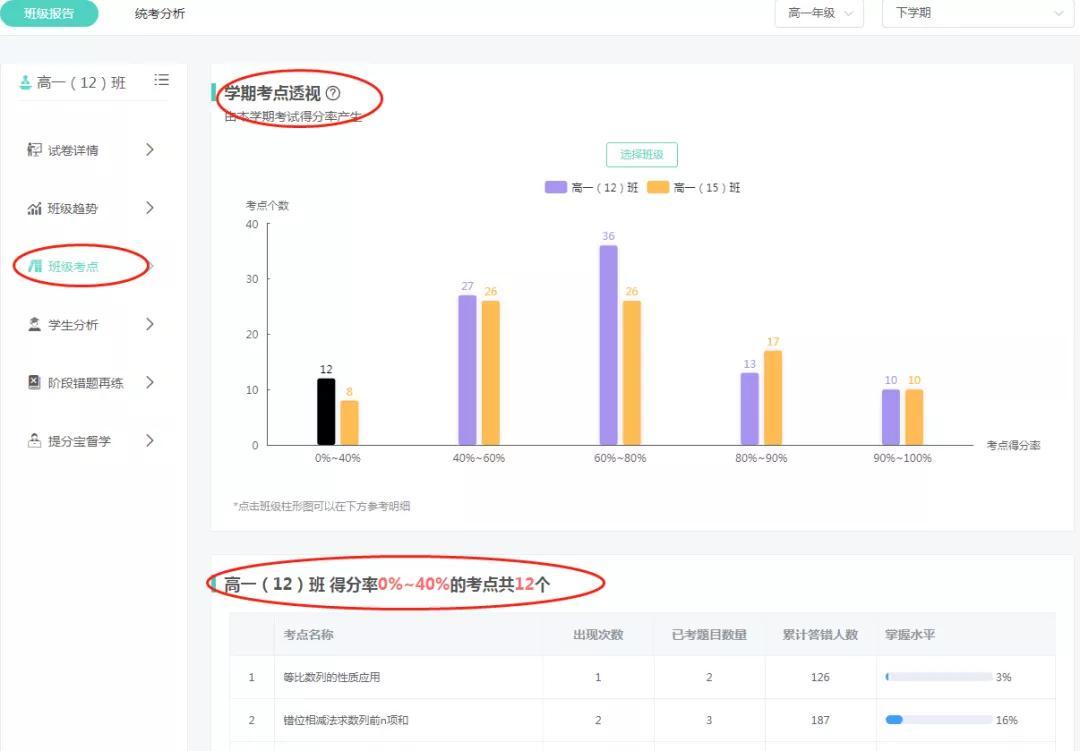 通过后台数据分析,将各班级考点得分率以一定阶段分隔开,自送匹配自动匹配各个阶段的考点,给教师教学提供数据支撑;同时,教研组可以根据班级考点情况,让本考点得分率高的班级教师分享教学经验,教师之间相互学习,在帮助学生掌握考点的同时实现教师团队的整体提升。