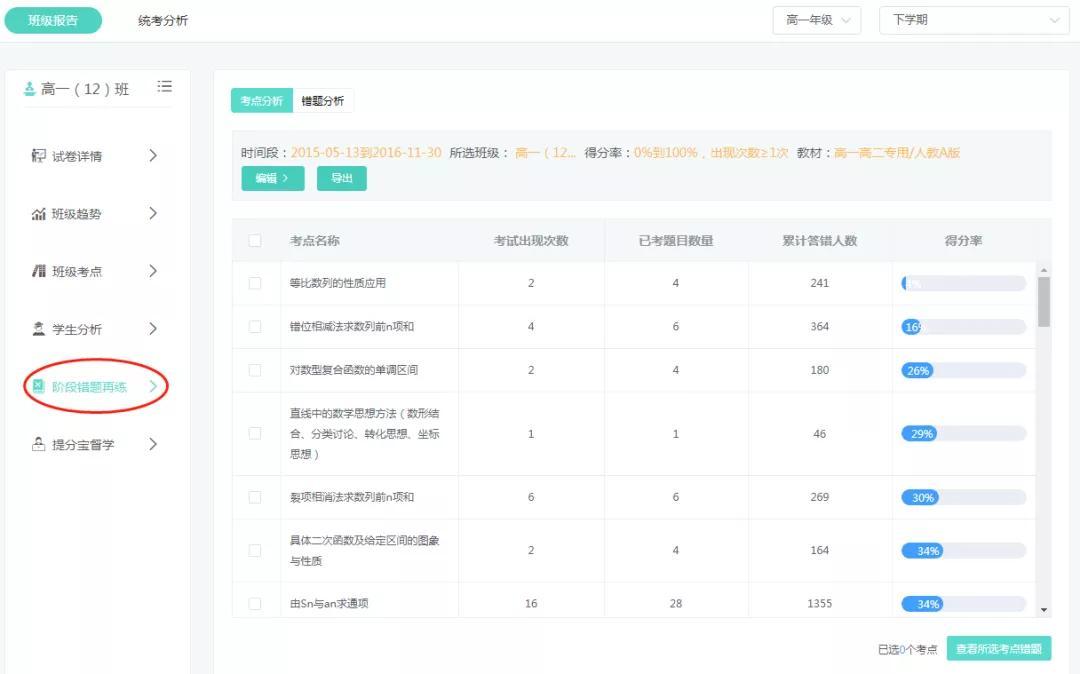 阶段考点,对整个高中的教学,特别是对高三复习尤其重要。教师输入一定筛选条件,可以查看班级甚至整个年级在任一时间段的所有问题考点。在教学之前,通过真实的数据对学生的薄弱点进行精准了解,再结合现有的资料和考纲要求,做备课与复习的整体规划,更加符合学生的学情。