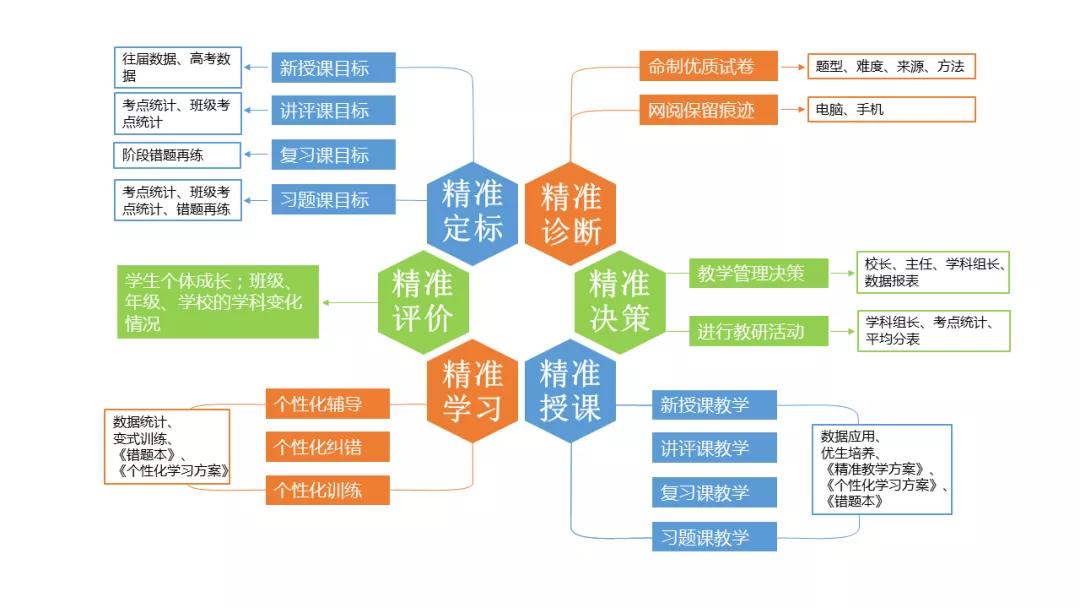 基于此,知心慧学结合学校实际教学过程,经过精准教学理论研究,通过大数据、人工智能等互联网技术,形成了六步精准教学模型,强化了教学过程中的六个关键环节——精准定标、精准诊断、精准决策、精准授课、精准学习、精准评价,每个环节的资源和技术支撑让教师精准关注到每一个学生,让教学更加科学高效!