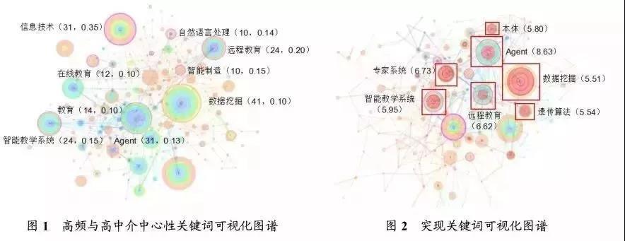 图中我们可以看到“数据挖掘”、“信息技术”、“远程教育”、“Agent”、“智能教学系统”等比较突出。
