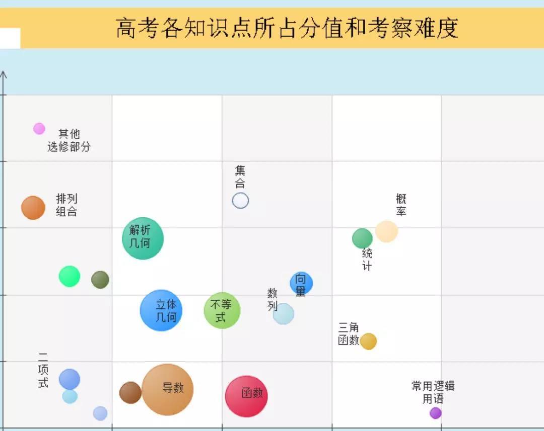 ▲高考数学知识图谱,大小表示高考所占分值,颜色表示难度