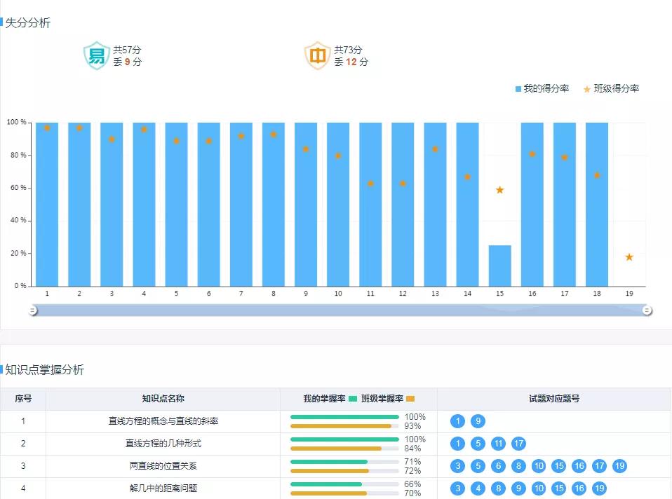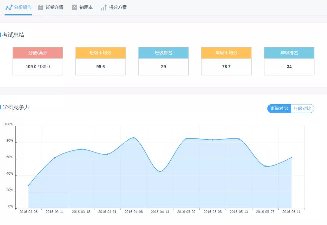 每次考试之后,学生可以第一时间登录知心慧学学生端,或及时通过“提分宝”查看自己的分数、班级平均分、班级排名、年级平均分和年级排名,学科竞争力变化趋势更能清晰了解本次考试整体情况,了解自身在班级乃至年级的分数区段,明确目标,争取向更高名次看齐。