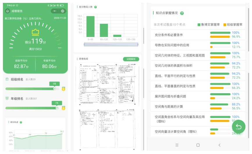 对于家长来说,了解学生学习情况同样重要。家长可以登录【知了家长】,班级平均分、年级平均分、班级排名、年级排名、学生成长轨迹、各分数段人数、知识点掌握情况等一目了然!家长能够根据孩子的学习成绩及排名及时帮助孩子查漏补缺,提高学习成绩,从而达到升学目的。