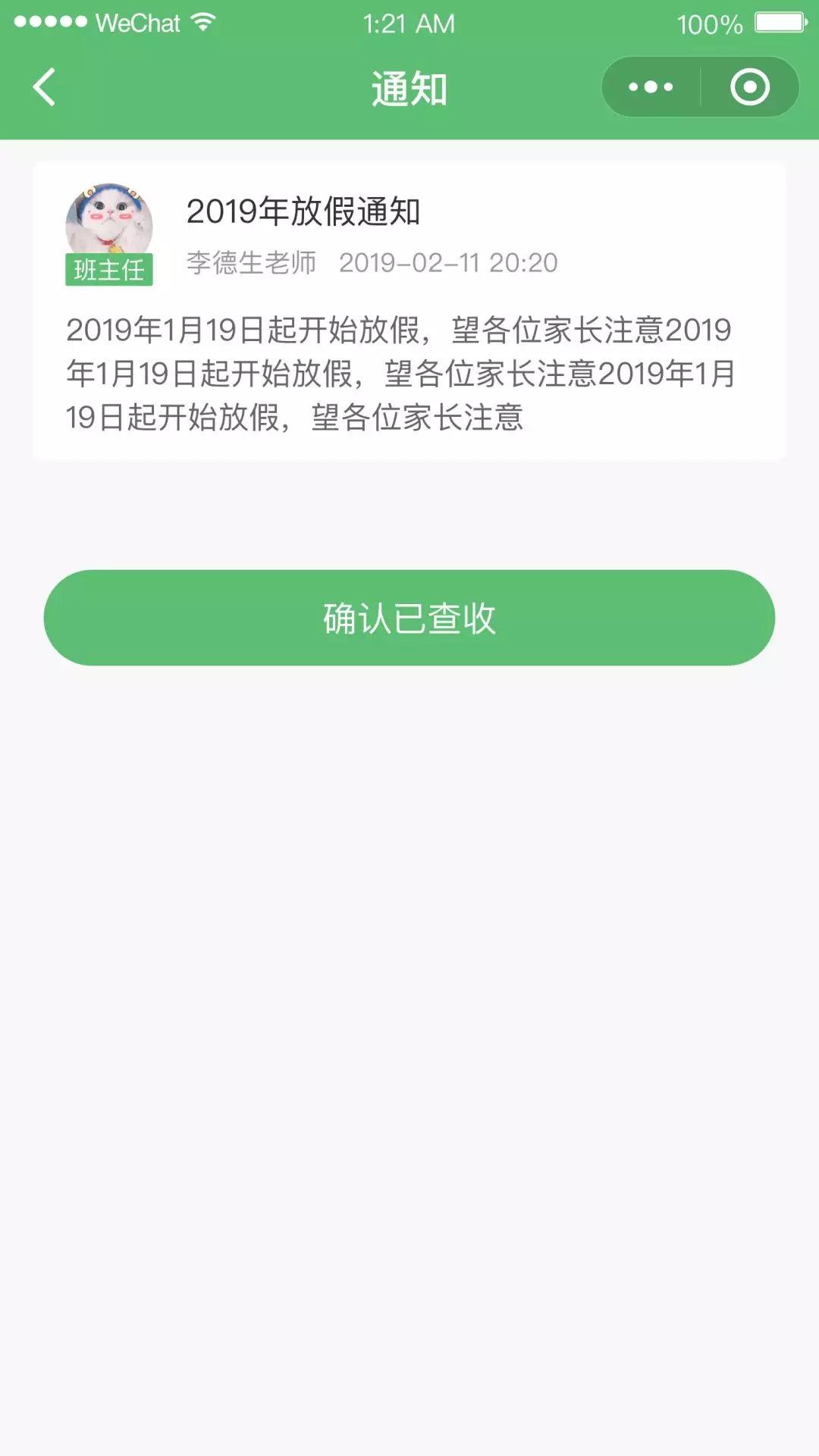拒绝刷屏!知了家校支持文字、图片、语音多种形式发送通知,老师根据需求自行选择;家长不再需要在群消息中翻阅“千山万岭”,一键轻松查收;系统自动统计已读未读,确保每位家长百分百收到通知,让教务通知更清晰。