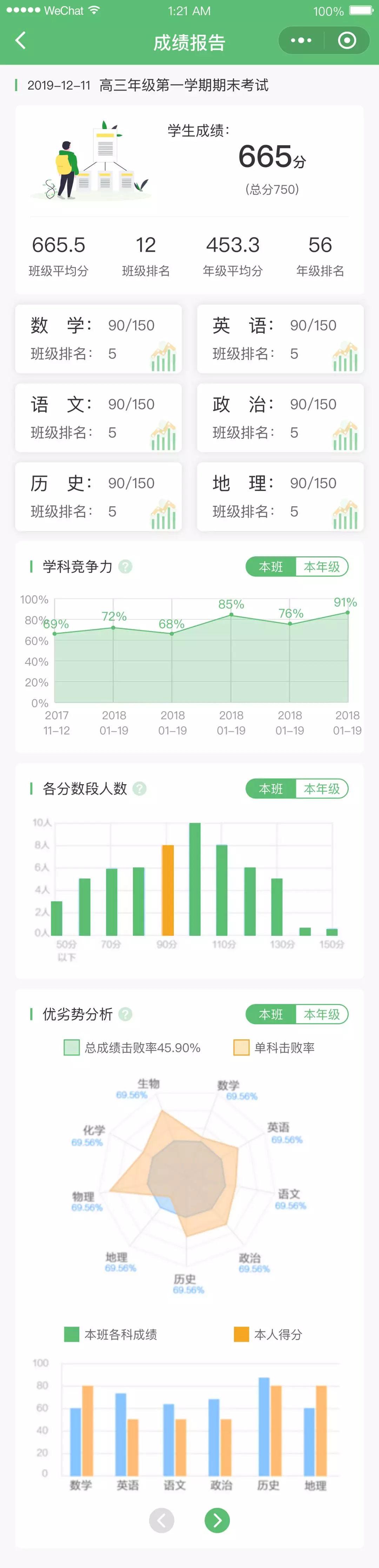 同时,家长在小程序中不仅能够了解孩子的成绩情况与竞争力,还能根据个性化的优劣势分析全面了解孩子学习情况,以配合学校进行家校共育,成为孩子学习的坚强后盾。
